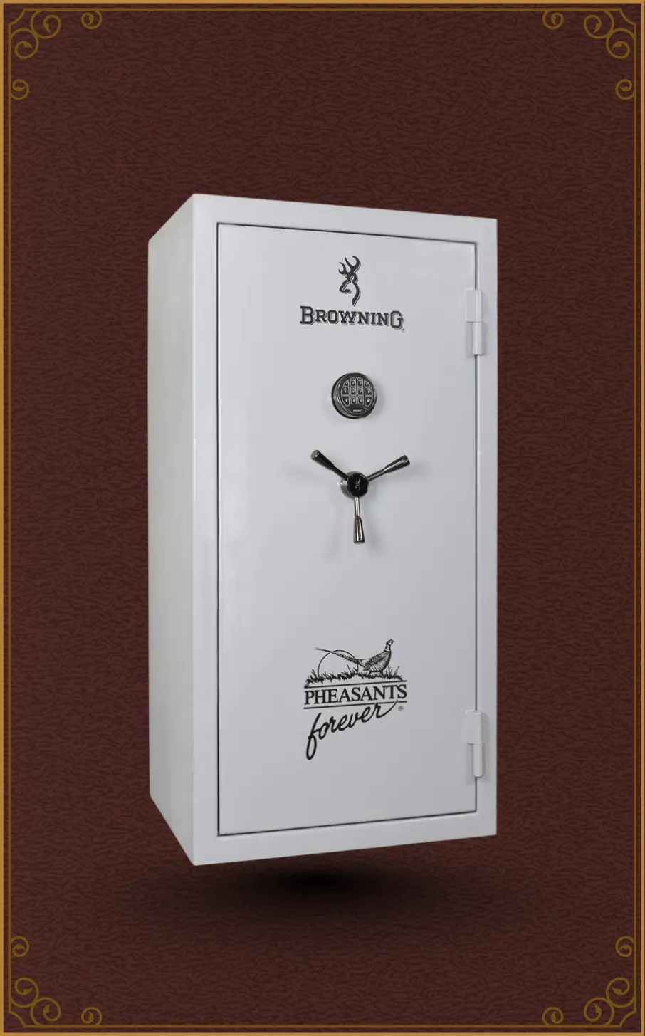 Browning Safes became a preferred partner for gun safes with Pheasants Forever to produced this special Upland edition of our Sporter-33 gun safe. Brandishing upland vest colors on the interior door panel and the Pheasants Forever logo on the door, this safe is clearly unique. The versatile gun safe delivers impressive security and quality in a cost-effective package. Rely on durable 12-gauge steel, 3-way chrome locking bolts, and up to an hour of fire and heat protection at 1,400°. Configure your CMS adjustable shelving for the perfect personalized layout.